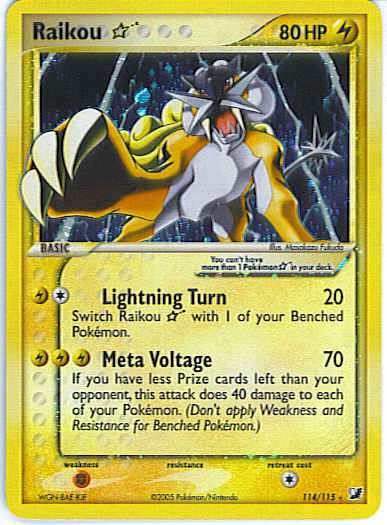 | Type | Lightning | | Pokemon serie | Unseen Forces | | Stadie | Basic | | HP | 80 | | Sjældenhed | Ultra-Rare | | Tilbagetrækning | 1 | | Svaghed | F | | Kortnummer | 114 | | Evne |