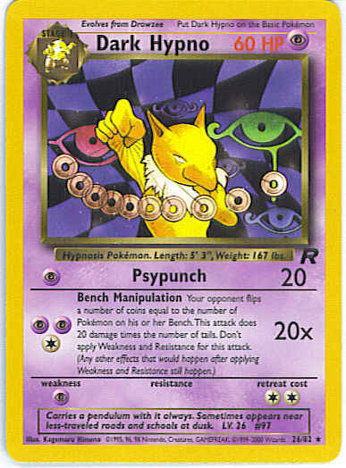 [CPP] Bench Manipulation (20x) Your opponent flips a number of coins equal to the number of Pokemon on his or her Bench. This attack does 20 damage times the number of tails. Don't apply Weakness and Resistance for this attack. (Any other effects that would happen after applying Weakness and Resistance still happen.)