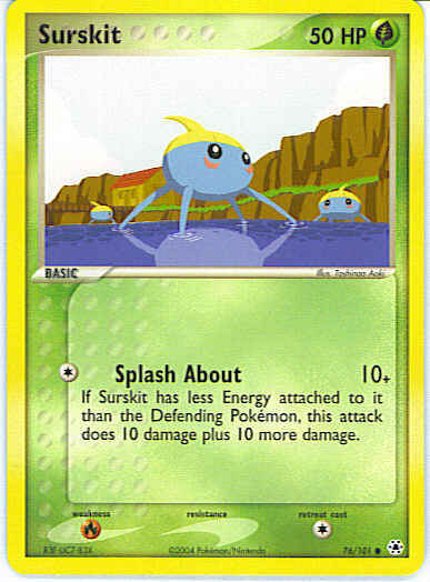 | Type | Grass | | Pokemon serie | Hidden Legends | | Stadie | Basic | | HP | 50 | | Sjældenhed | Common | | Tilbagetrækning | 1 | | Svaghed | R | | Kortnummer | 76 | | Evne | [C] Splash About (10+) If Surskit has less Energy attached to it than the Defending Pokemon, this attack does 10 damage plus 10 more damage. | | Evne2 | [C] Splash About (10+) If Surskit has less Energy attached to it than the Defending Pokemon, this attack does 10 damage plus 10 more damage. | | Kunstner | Toshinao Aoki |