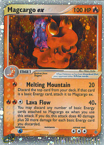 | Type | Fire | | Pokemon serie | Dragon | | Stadie | Stage 1 | | HP | 100 | | Sjældenhed | Ultra-Rare | | Tilbagetrækning | 3 | | Svaghed | W | | Kortnummer | 95 | | Evne | [R] Melting Mountain (20) Discard the top card from your deck. If that card is a basic Energy card, attach it to Magcargo ex. [CRR] Lava Flow (40+) You may discard any number of basic Energy cards attached to Magcargo ex when you use this attack. If you do, this attack does 40 damage plus 20 damage for each basic Energy card you discarded. | | Evne2 | [R] Melting Mountain (20) Discard the top card from your deck. If that card is a basic Energy card, attach it to Magcargo ex. [CRR] Lava Flow (40+) You may discard any number of basic Energy cards attached to Magcargo ex when you use this attack. If you do, this attack does 40 damage plus 20 damage for each basic Energy card you discarded. | | Kunstner | Hikaru Koike |