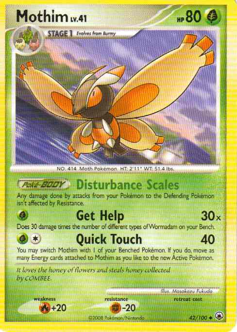 [CG] Quick Touch (40) You may switch Mothim with 1 of your Benched Pokemon. If you do, move as many Energy cards attached to Mothim as you like to the new Active Pokemon.