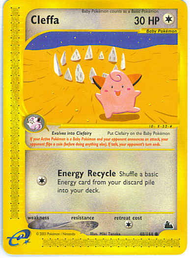| Type | Colorless | | Pokemon serie | Skyridge | | Stadie | Baby | | HP | 30 | | Sjældenhed | Common | | Tilbagetrækning | 1 | | Kortnummer | 48 | | Evne | [C] Energy Recycle - Shuffle a basic Energy card from your discard pile into your deck.