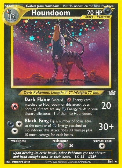 | Type | Darkness | | Pokemon serie | Neo Revelation | | Stadie | Stage 1 | | HP | 70 | | Sjældenhed | Rare | | Tilbagetrækning | 1 | | Modstand | P | | Kortnummer | 8 | | Evne |