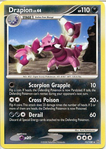 [0] Scorpion Grapple (10) Flip a coin. If heads, the Defending Pokemon is now Paralyzed. If tails, the Defending Pokemon can't retreat during your opponent's next turn.