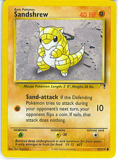 [F] Sand-attack (10) If the Defending Pokemon tries to attack during your opponent's next turn, your opponent flips a coin. If tails, this attack does nothing.